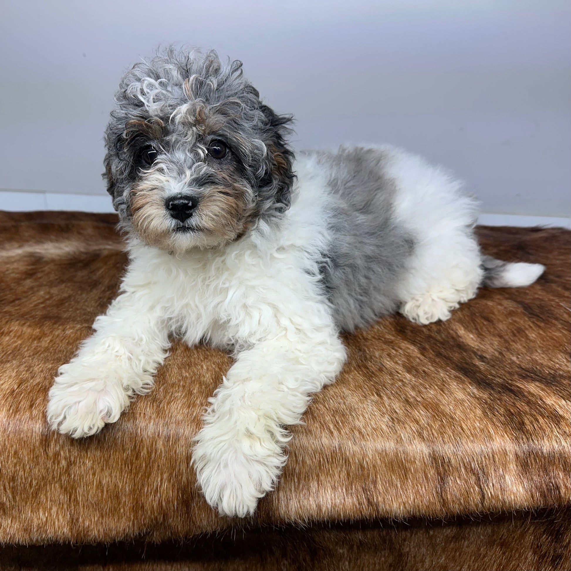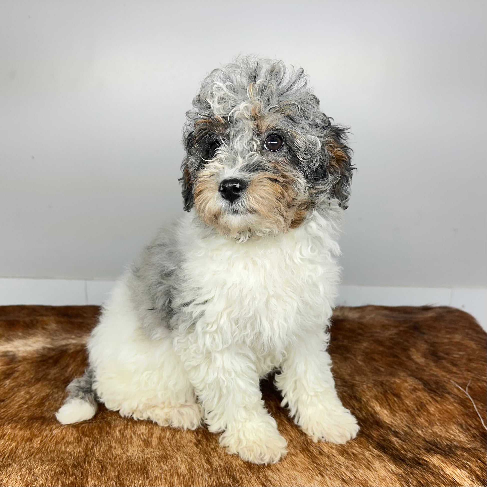 Alaska, our stunning Merle Mini Bernedoodle with an eye-catching blend of blue merle and tricolor markings that make her truly one of a kind. Her soft, wavy coat showcases beautiful shades of silver, black, white, and warm tan, giving her a look that’s both elegant and unique. Alaska’s personality is just as captivating—she’s affectionate, intelligent, and full of playful charm. Whether she’s cuddling up for nap time or exploring by your side, Alaska’s gentle and loyal nature shines through. She’s the perfect Merle Mini Bernedoodle for anyone looking for a loving companion with both beauty and heart.