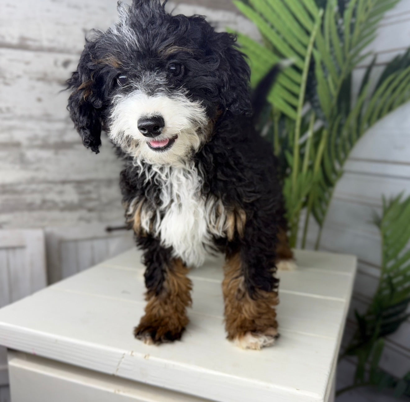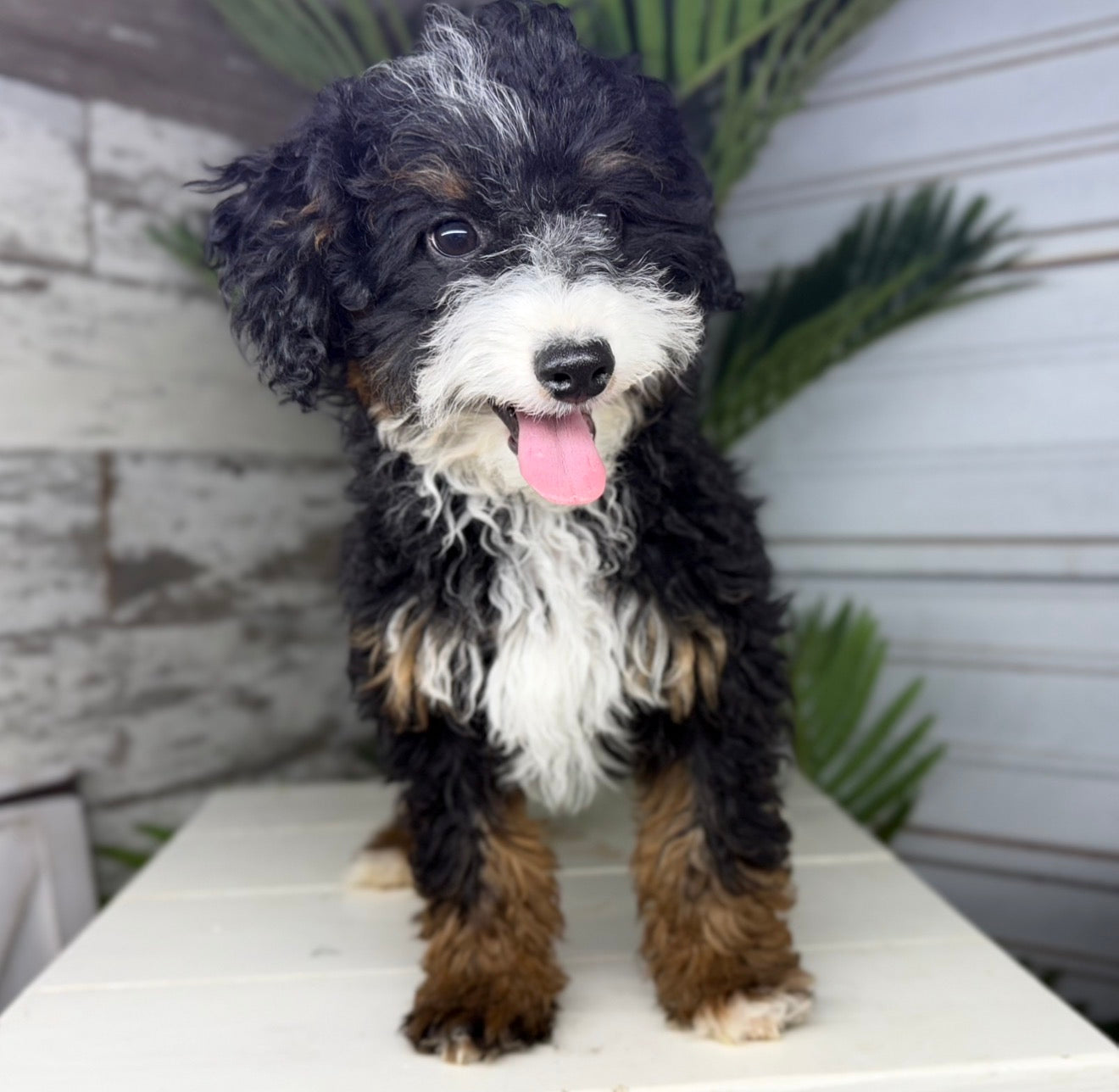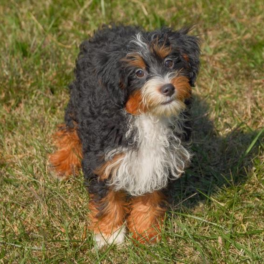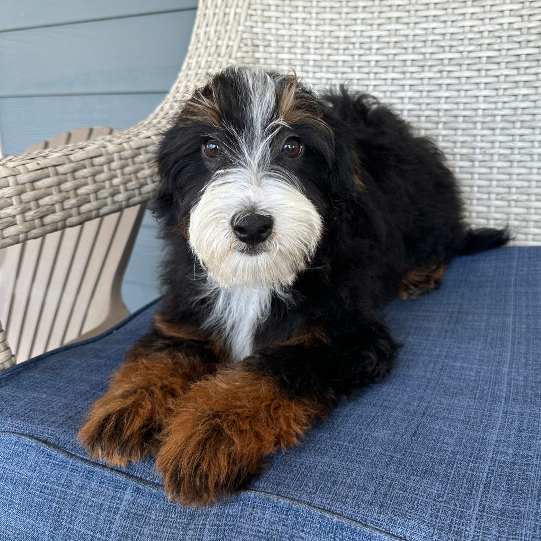 Amber is a stunning Tri-Color Mini Bernedoodle with a personality as warm as her name. Her luxurious coat features the classic Bernedoodle patternβrich black as the base, accented with warm rust markings and crisp white highlights across her chest, muzzle, and paws. Compact and cuddly, Amber is the perfect size for those who want all the beauty and charm of a Bernedoodle in a smaller, more manageable package. Sheβs not just beautifulβAmber is affectionate, playful, and intelligent, making her an ideal companion for families, singles, or anyone looking for a loyal best friend. Whether sheβs curling up on your lap, learning new tricks, or exploring the outdoors, Amber brings joy and love into every moment.
