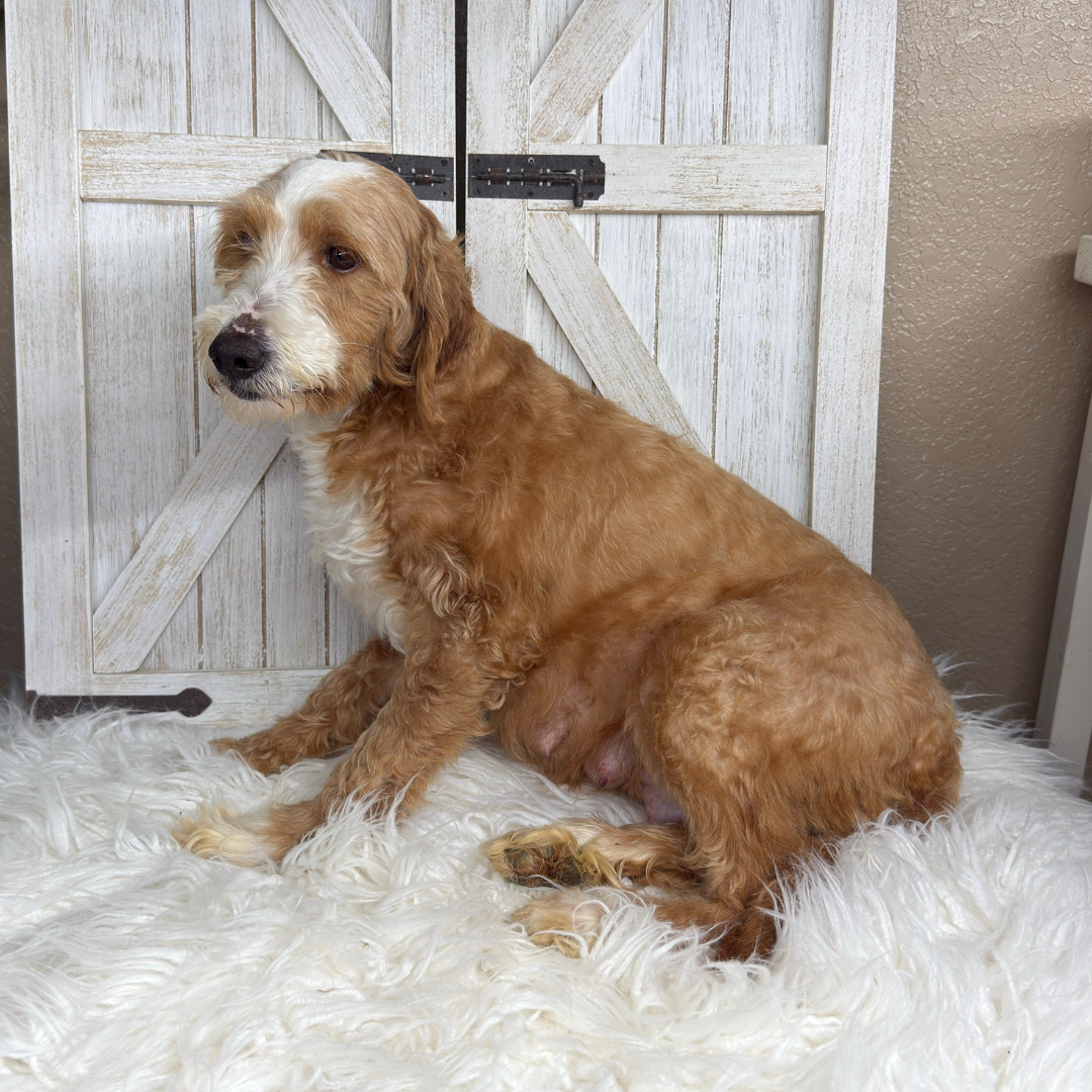 Piper is a beautiful red and white Goldendoodle mama with a heart full of love and devotion. Her striking coat, a rich blend of deep red and crisp white, is as soft as it is stunning. Gentle and affectionate, Piper has a nurturing and calm demeanor that makes her an excellent mother to her puppies. With the intelligence of a Poodle and the friendly nature of a Golden Retriever, she is both easy to train and eager to please. Whether she’s playing, cuddling, or caring for her little ones, Piper’s loving personality and elegant beauty make her a truly special dog.