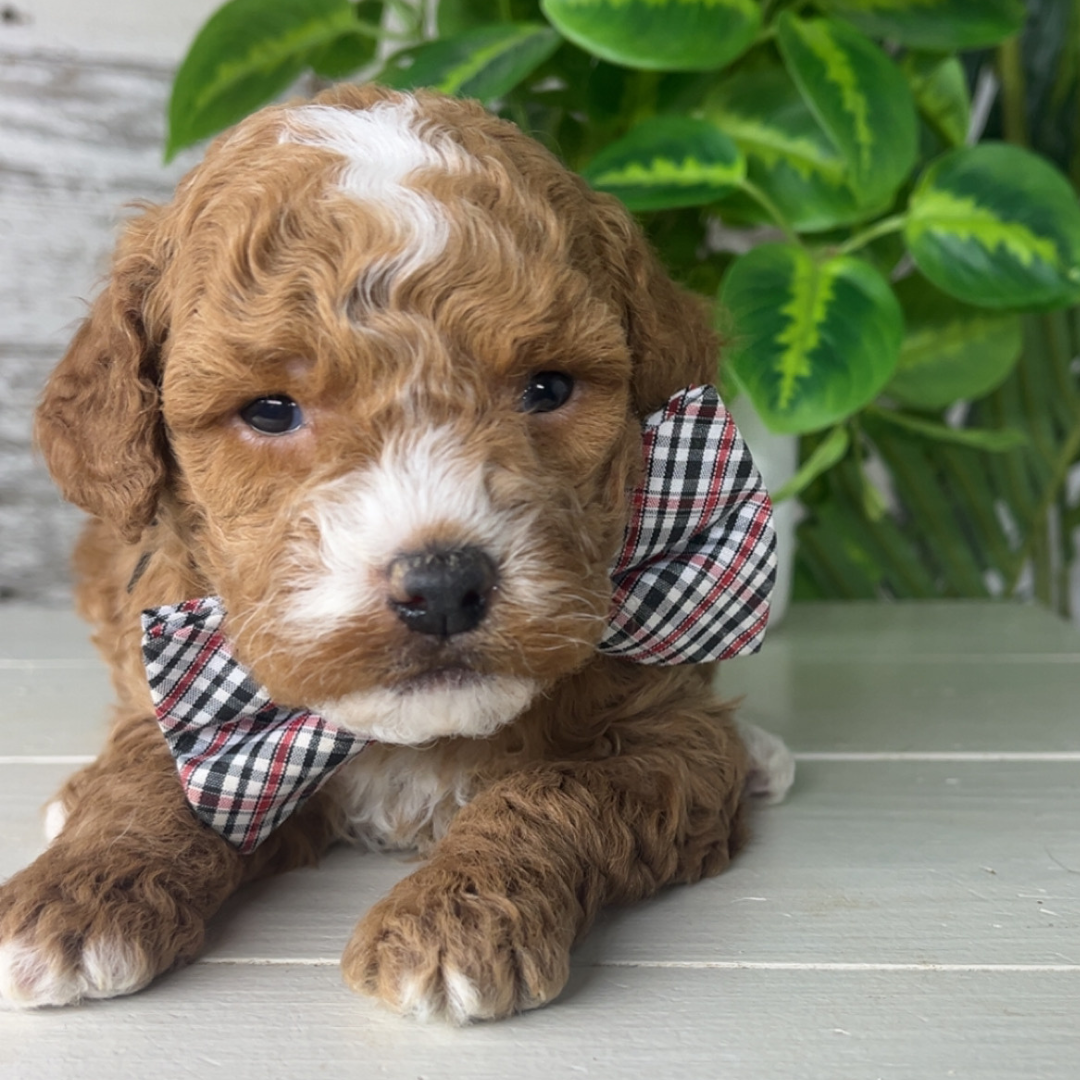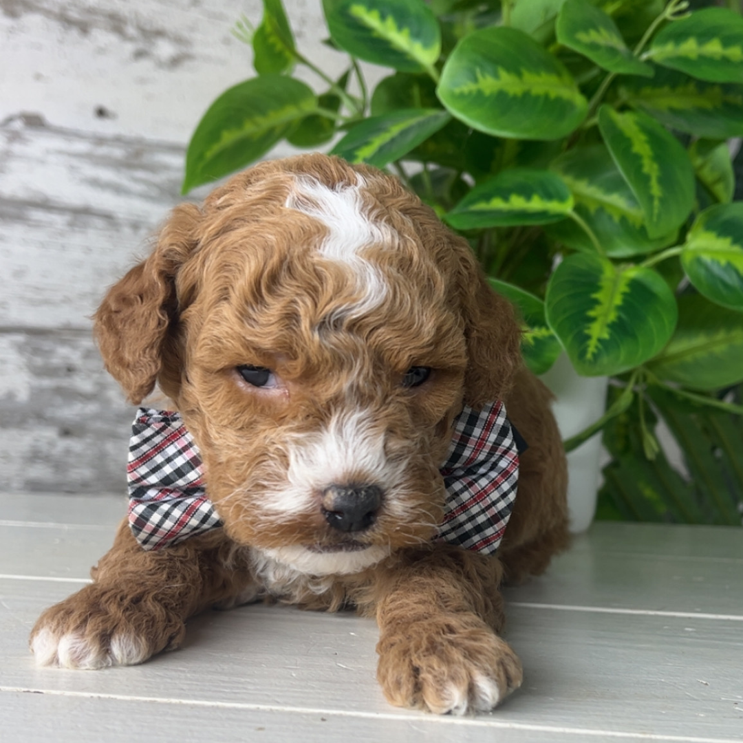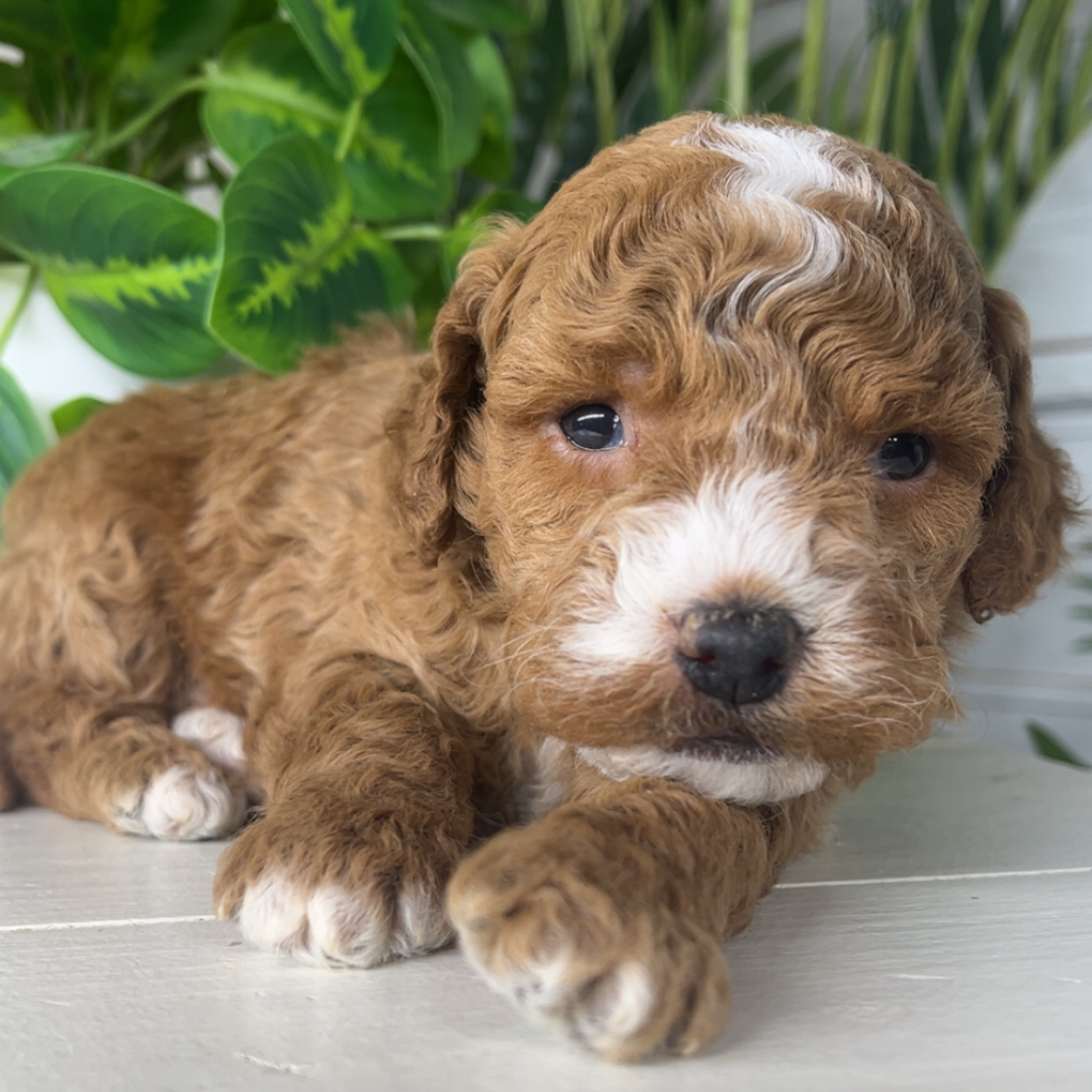 Bear is a tiny heart-stealer with a rich red coat and the cutest signature markings. He has a charming white swirl on his head, a touch of white on his snout, and little white paws that look like he’s wearing tiny socks. His unique pattern makes him instantly recognizable and incredibly photogenic. Despite his bold name, Bear is a gentle sweetheart. He loves cuddling, following you around with his soft little trot, and curling up for naps after playtime. His personality is a perfect blend of sweetness, curiosity, and calm — making him an ideal companion for any loving home. Bear’s one-of-a-kind markings and warm, affectionate nature make him truly special. Whether he’s exploring with his siblings or snuggling in your arms, he brings joy, comfort, and that classic Goldendoodle charm everywhere he goes.