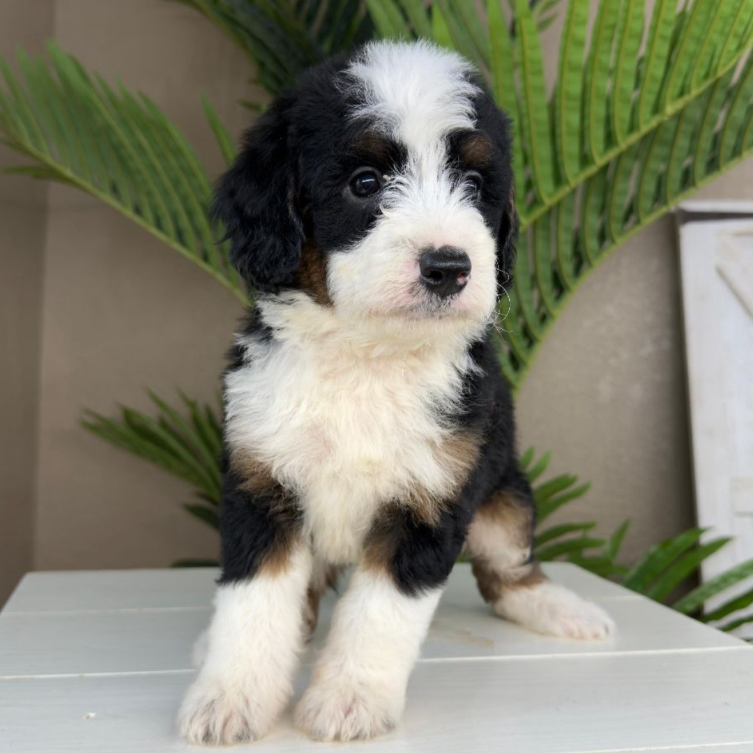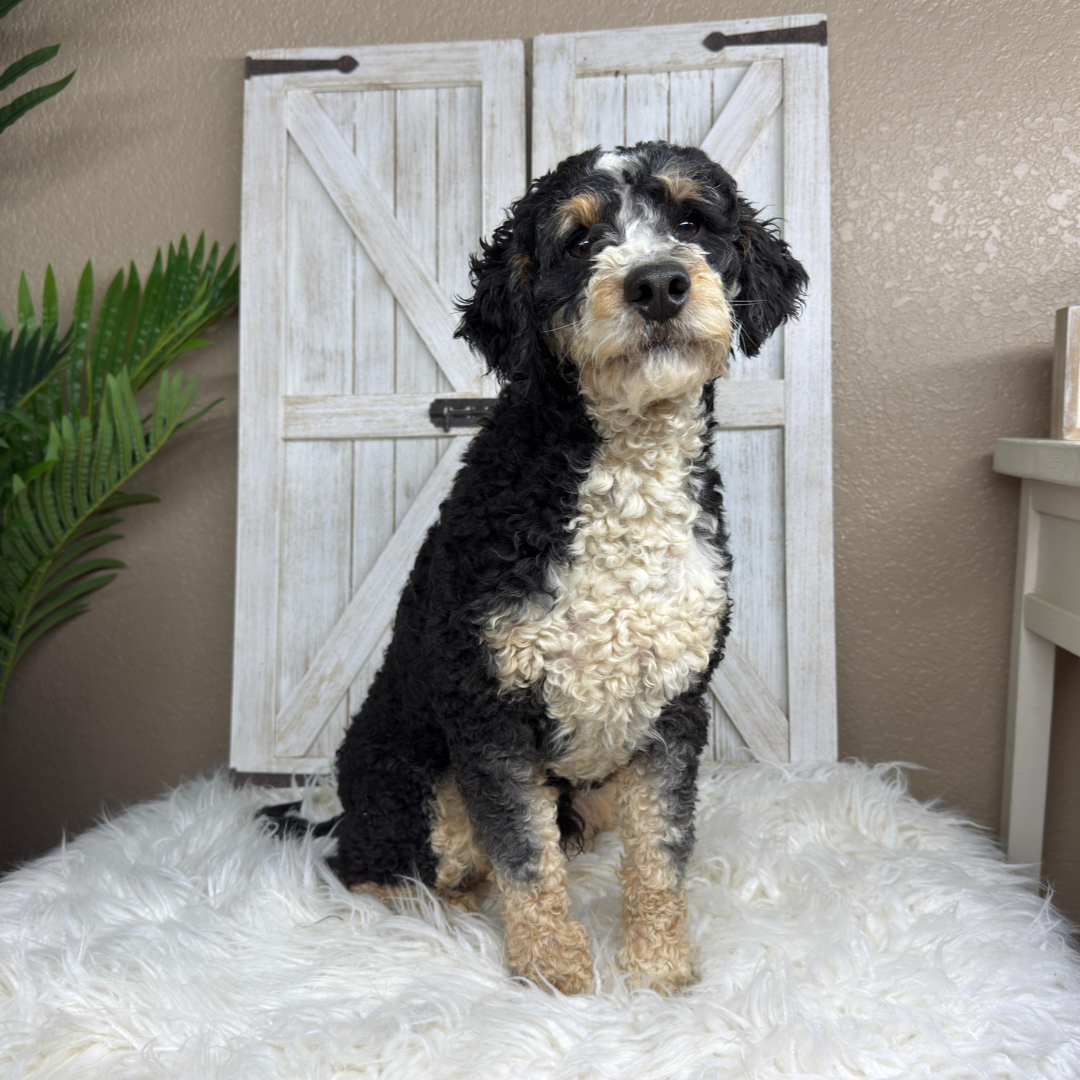 Star, our dazzling Tricolor Mini Bernedoodle who truly lives up to her name. With her striking mix of jet-black, snowy white, and warm copper markings, she shines with beauty and charm in every setting. Her bright, curious eyes sparkle with intelligence and warmth, making her as captivating as she is sweet.Β Star is playful, affectionate, and full of personality. She loves adventures, belly rubs, and being the center of attentionβyet sheβs just as happy to curl up beside you for quiet cuddles. With her gentle nature and loving heart, Star brings light and happiness wherever she goes. Sheβs not just a puppyβsheβs a little burst of joy that brightens every day.