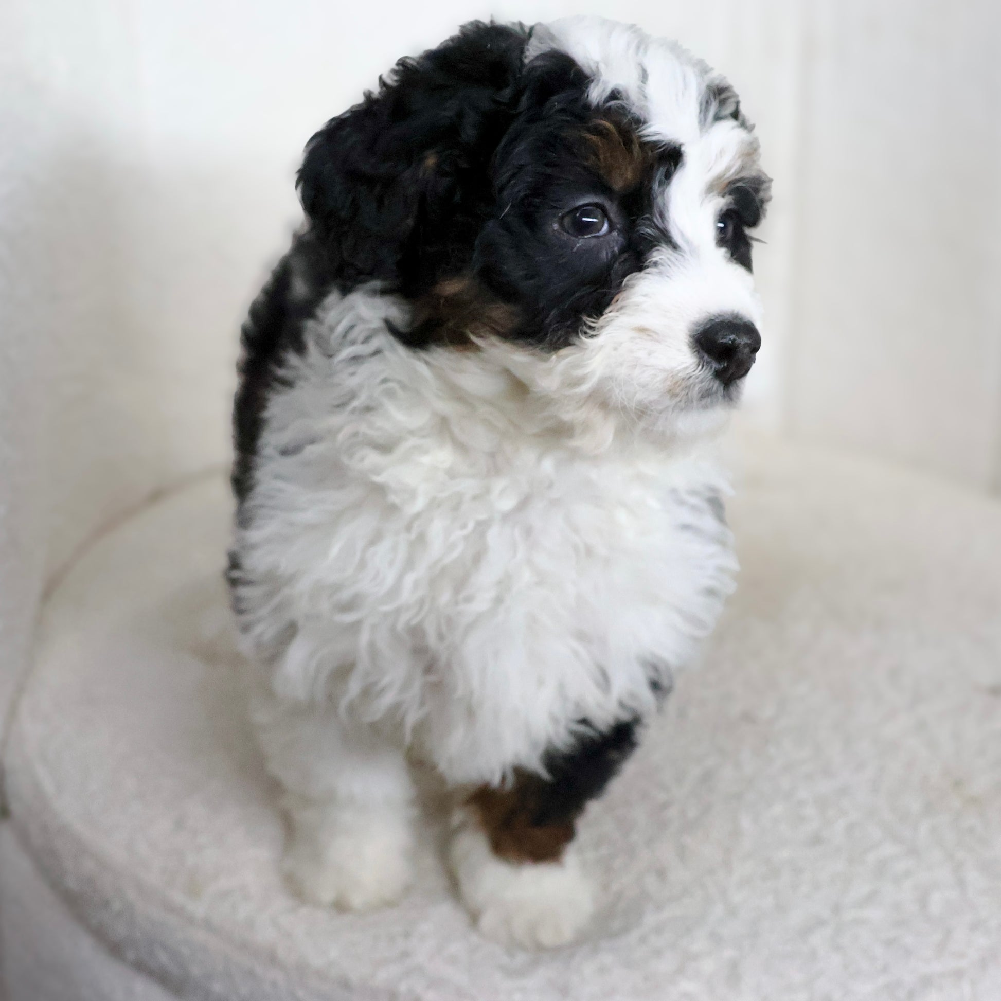 Coco is an adorable Mini Bernedoodle with a classic tri-color coat — rich black, warm tan, and crisp white markings that give her a charming and playful look. Her pattern is lively and eye-catching, making her truly unforgettable. She’s loving, gentle, and enjoys being near her people. Coco delights in relaxed walks, cozy snuggles, and simply sharing time with her favorite humans. Her sweet and friendly demeanor makes her an ideal companion for any home. With her striking tri-color coat and affectionate personality, Coco is a special little girl ready to bring happiness, love, and plenty of Bernedoodle magic to her forever family.