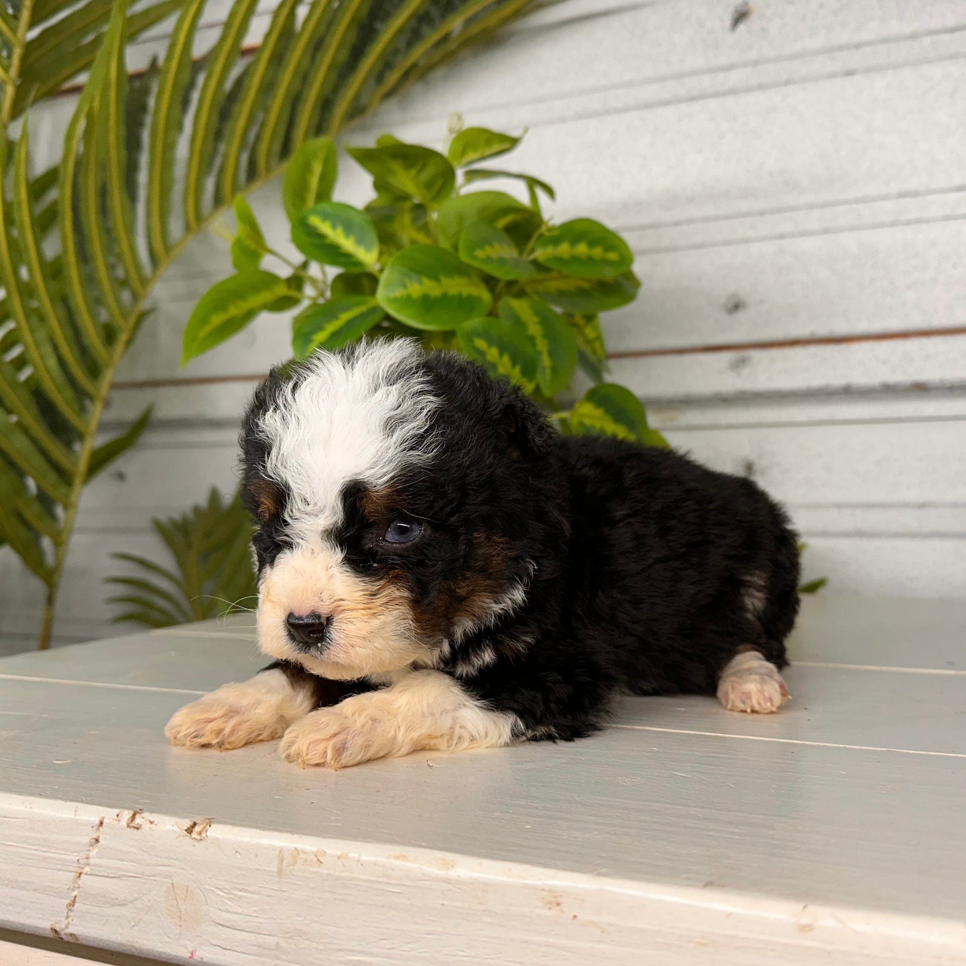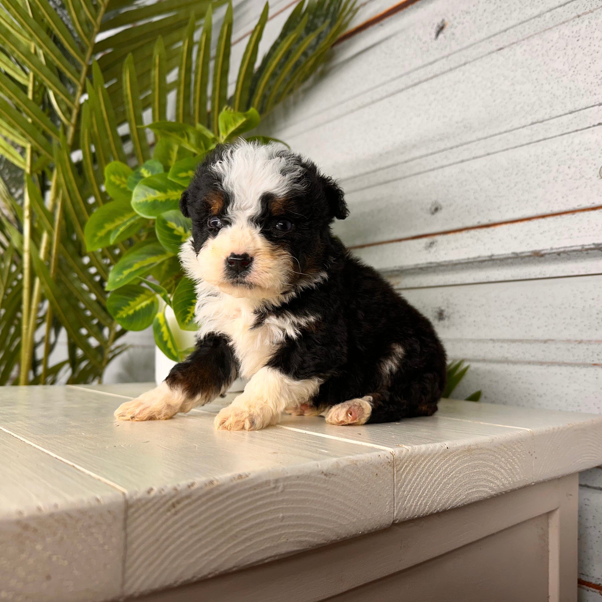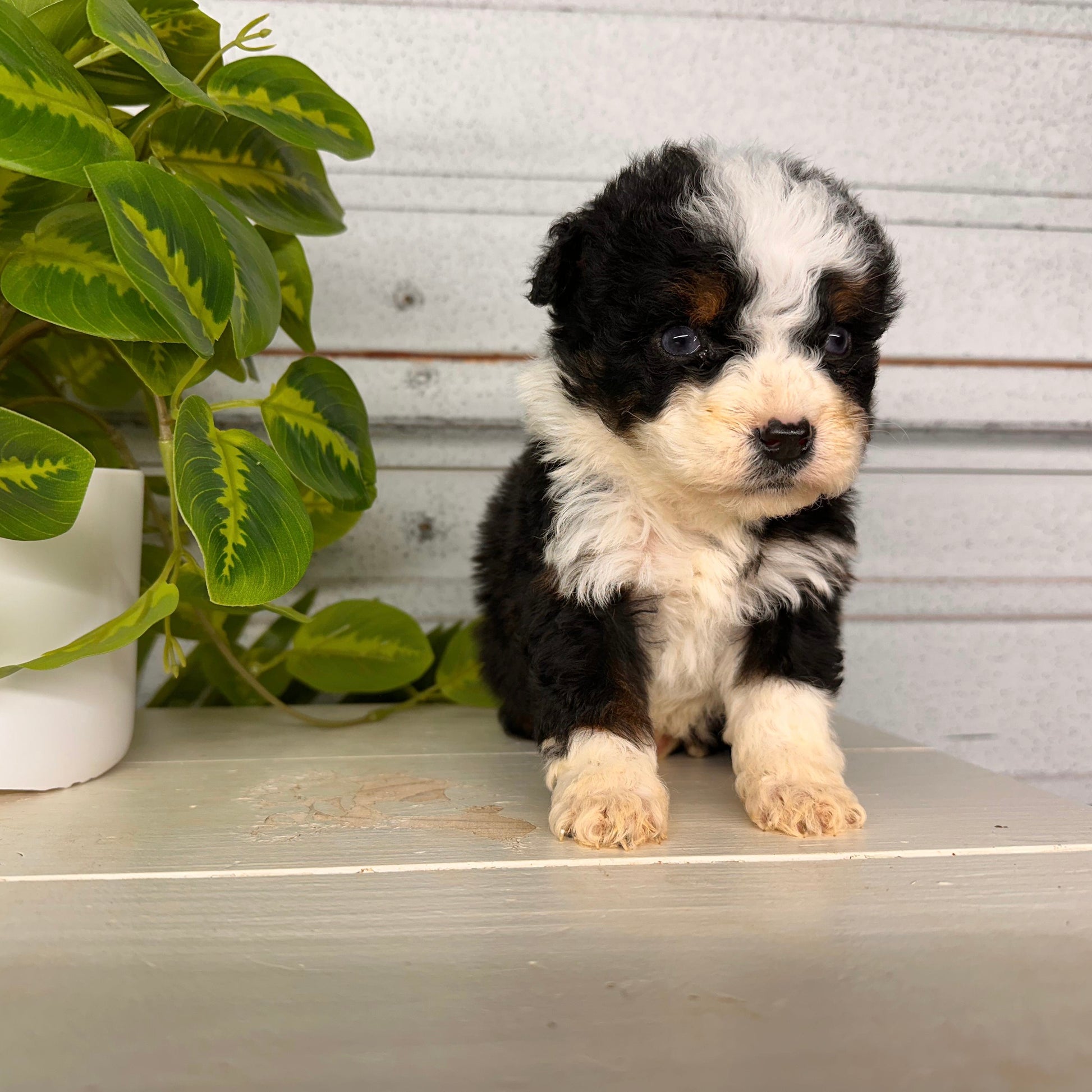 Hazel is a tiny treasure with a stunning classic tricolor coat — rich black, warm brown points, and crisp white accents that come together in the most picture-perfect way. As a Micro Bernedoodle, she’s irresistibly petite but full of personality, charm, and sweetness. Hazel has the softest expression and a gentle, affectionate nature. She loves being close to people, enjoys quiet cuddles, and is always ready to offer tiny tail wags whenever someone gives her attention. She’s curious but calm, making her a delightful companion in any home. Her tricolor markings are beautifully defined, giving her that signature Bernedoodle look in the cutest small size. From her expressive little eyebrows to the white on her chest and paws, Hazel truly stands out as something special. Whether she’s snuggling in your lap or exploring the world with her siblings, Hazel brings warmth, joy, and that unmistakable Bernedoodle charm everywhere she goes.