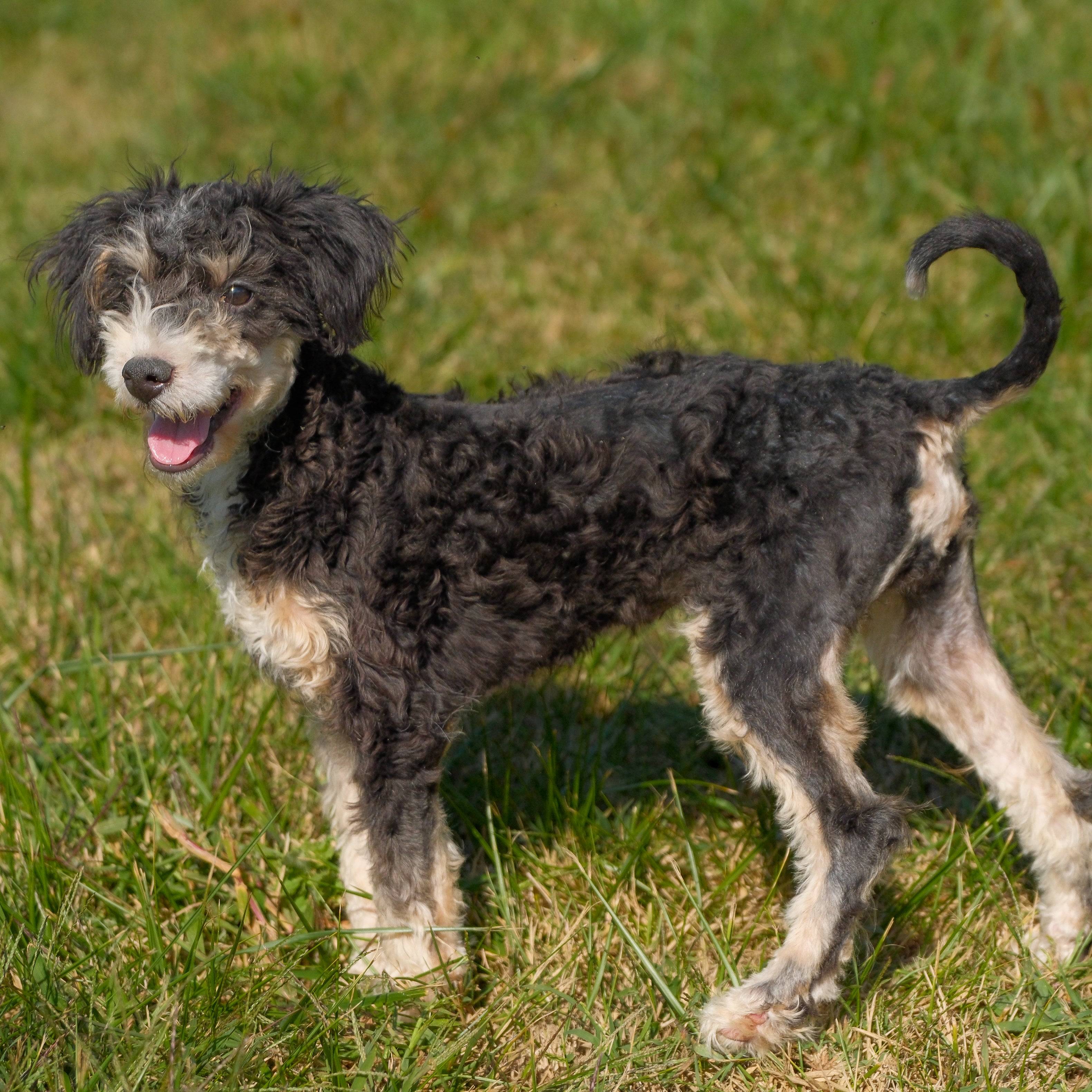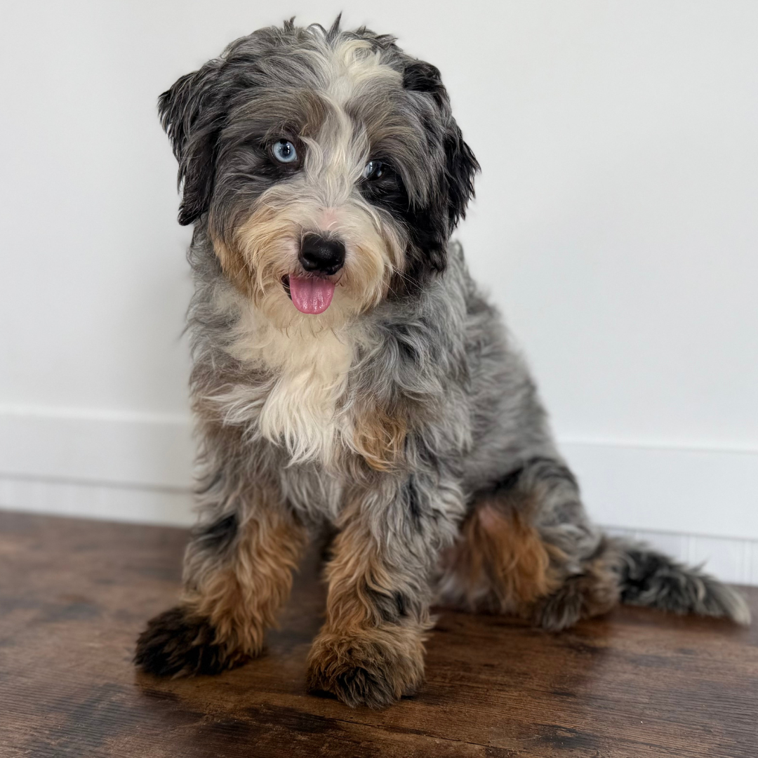 Donald, our handsome Micro Bernedoodle papa whose charm and confidence make him a true standout. With his rich, wavy tricolor coat and bright, soulful eyes, Donald has that perfect blend of sophistication and playfulness that everyone adores. He’s a little dog with a big personality—friendly, affectionate, and always eager to please. Donald loves to show off his smarts, whether it’s learning new tricks or being the first to greet you with a happy tail wag. His calm yet cheerful demeanor makes him an excellent companion and an outstanding sire, passing on his beautiful coat, gentle nature, and loving temperament to his puppies. Donald is the definition of a proud papa with a heart full of love and joy.