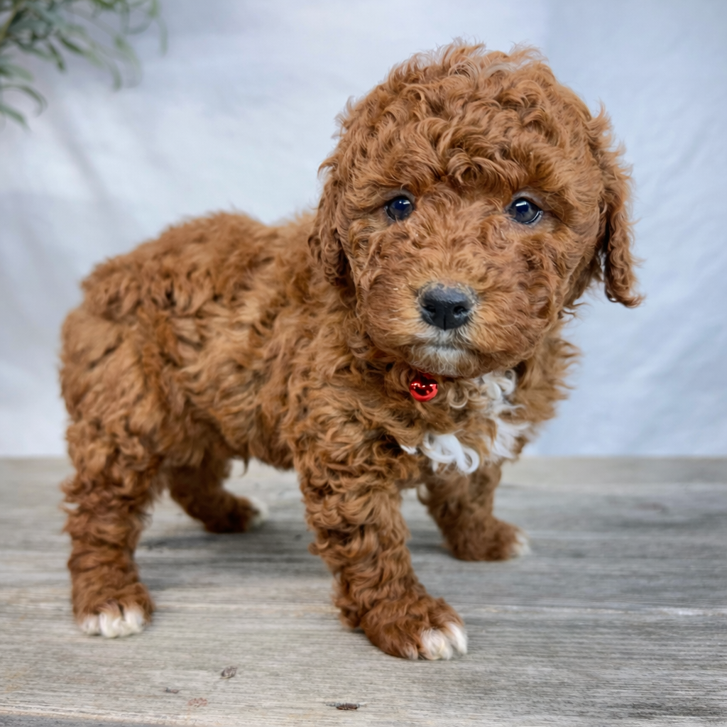 Benji, our handsome red Mini Poodle papa dog. With his rich, velvety red coat and lively, intelligent eyes, Benji is as charming as he is smart. He has a playful, spirited personality and a loyal, affectionate nature that shines through in everything he does. As a papa, Benji passes down not only his striking looks but also his wonderful temperament—bright, loving, and full of character—making his puppies just as delightful as he is.
