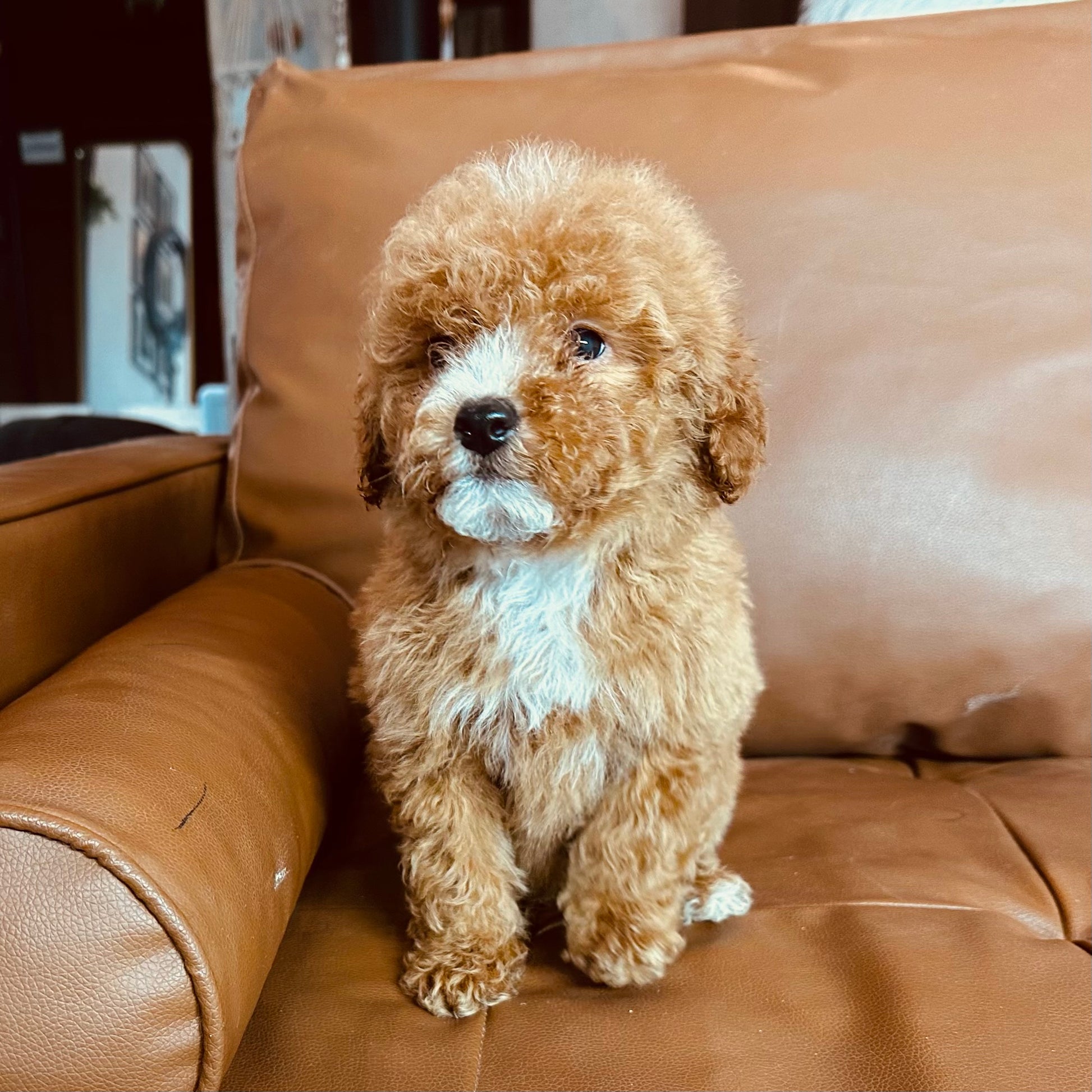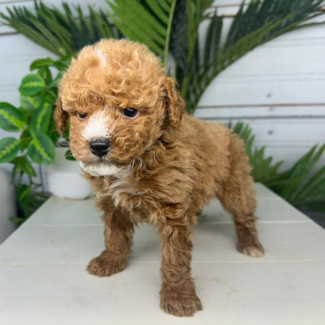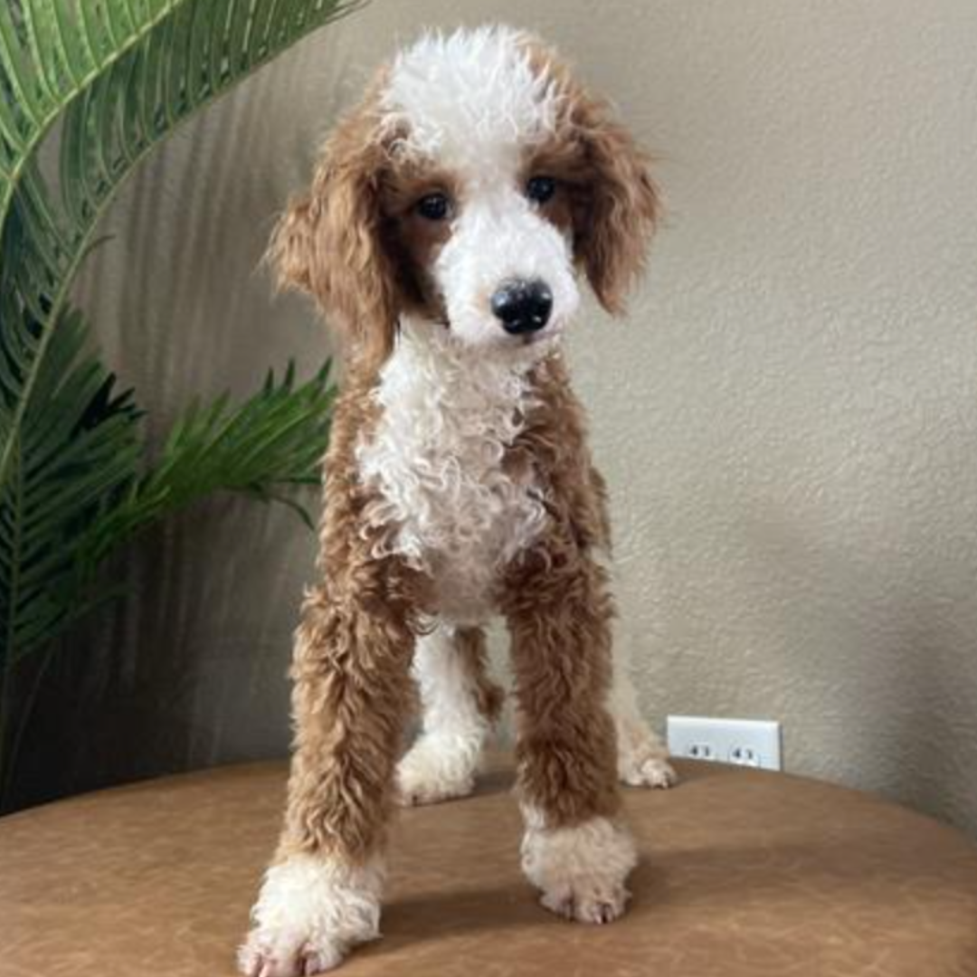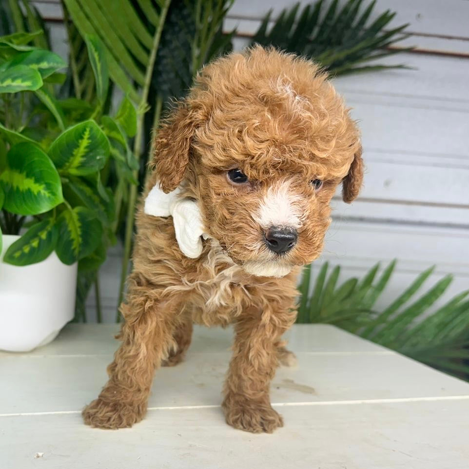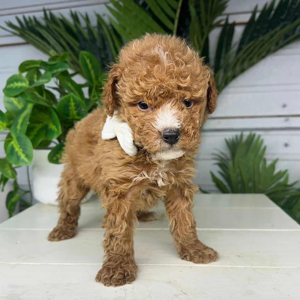 Justin is a handsome and affectionate male Micro Goldendoodle with a striking red and white coat that gives him a classic, eye-catching look. His rich red coloring paired with bright white markings highlights his adorable teddy-bear appearance and sweet expression.Β Justin has a loving, friendly personality and truly enjoys being around people. Heβs playful without being overwhelming, curious about his surroundings, and happiest when heβs close to his humans. Whether heβs exploring with his little confident trot or settling in for cuddles, Justin brings warmth and joy wherever he goes.Β With his gentle temperament and charming nature, Justin is the perfect companion for a loving home. He combines the best of the Goldendoodle personality β affectionate, intelligent, and easygoing β making him an ideal addition to any family looking for a loyal and adorable puppy.