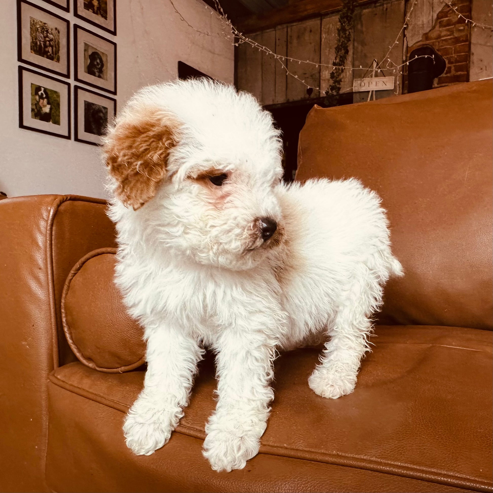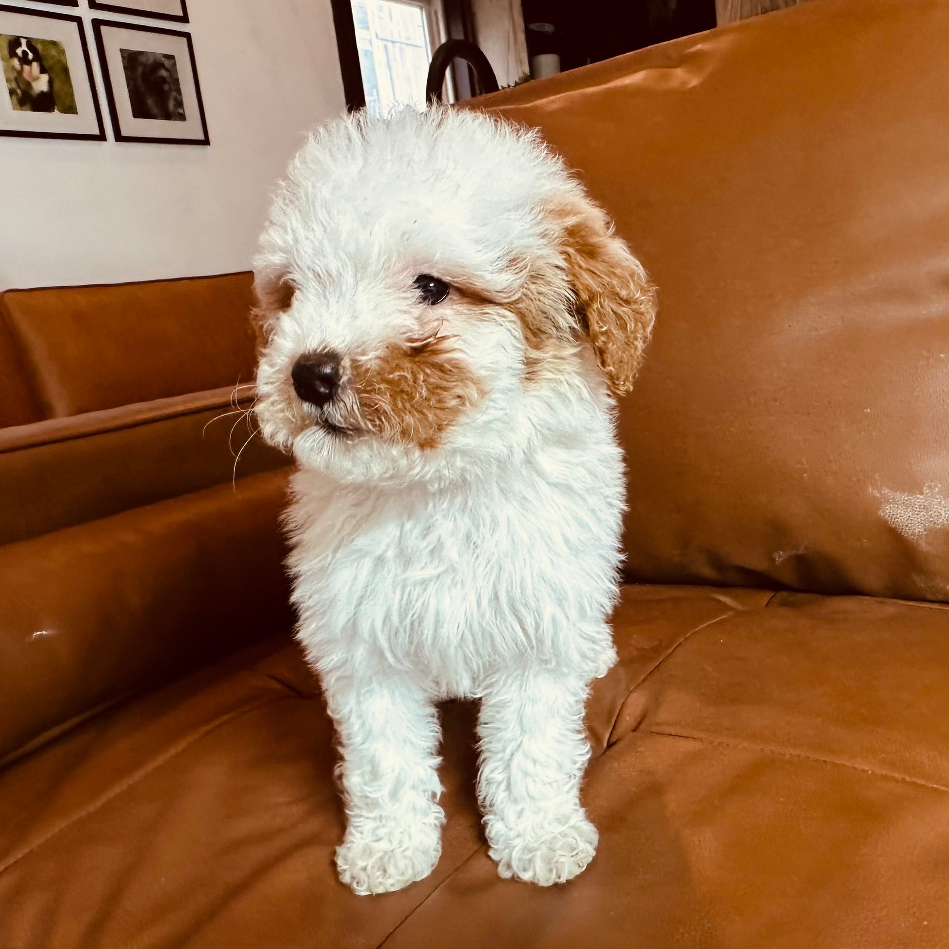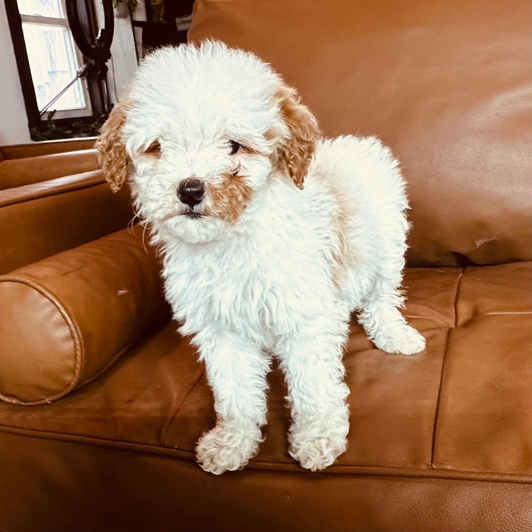 Velvet, our handsome Poodle papa with a striking red and white coat that's as soft and luxurious as his name suggests. Velvet is elegant in appearance and gentle in spirit, with a playful spark that makes him a joy to be around. He's intelligent, affectionate, and always eager to please-traits he proudly passes down to his puppies. Whether he's showing off his graceful prance or snuggling up for quiet time, Velvet brings a calm, confident presence to our home.