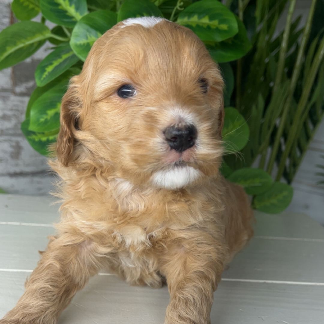 Leo is a tiny treasure with the softest expression and the sweetest features. His rich coat is accented by an adorable white spot on his head and small touches of white on his paws, giving him a look that’s both unique and irresistibly charming. And those tiny, delicate eyes? They make him look like he’s always ready for a cuddle. Gentle, affectionate, and curious, Leo loves being close to people. He enjoys snuggling, exploring little corners of his play area, and sticking right by your side with his cute little trot. Despite his petite size, his personality is warm, loving, and full of quiet sweetness. With his precious markings and soft, soulful presence, Leo is the kind of Micro Goldendoodle that melts hearts instantly. Whether he’s curled up for a nap or gazing up at you with his tiny eyes, he brings pure comfort and joy to any home.