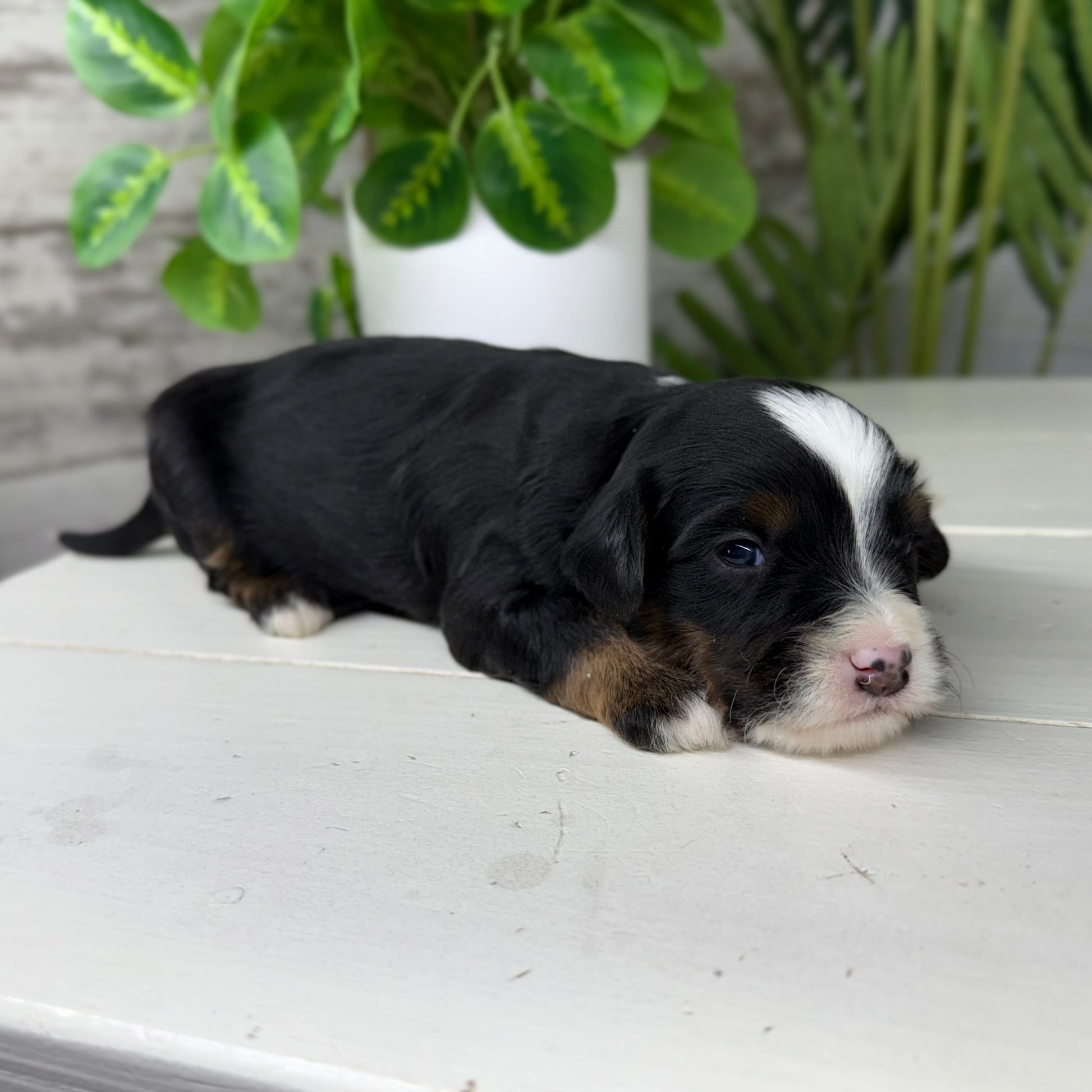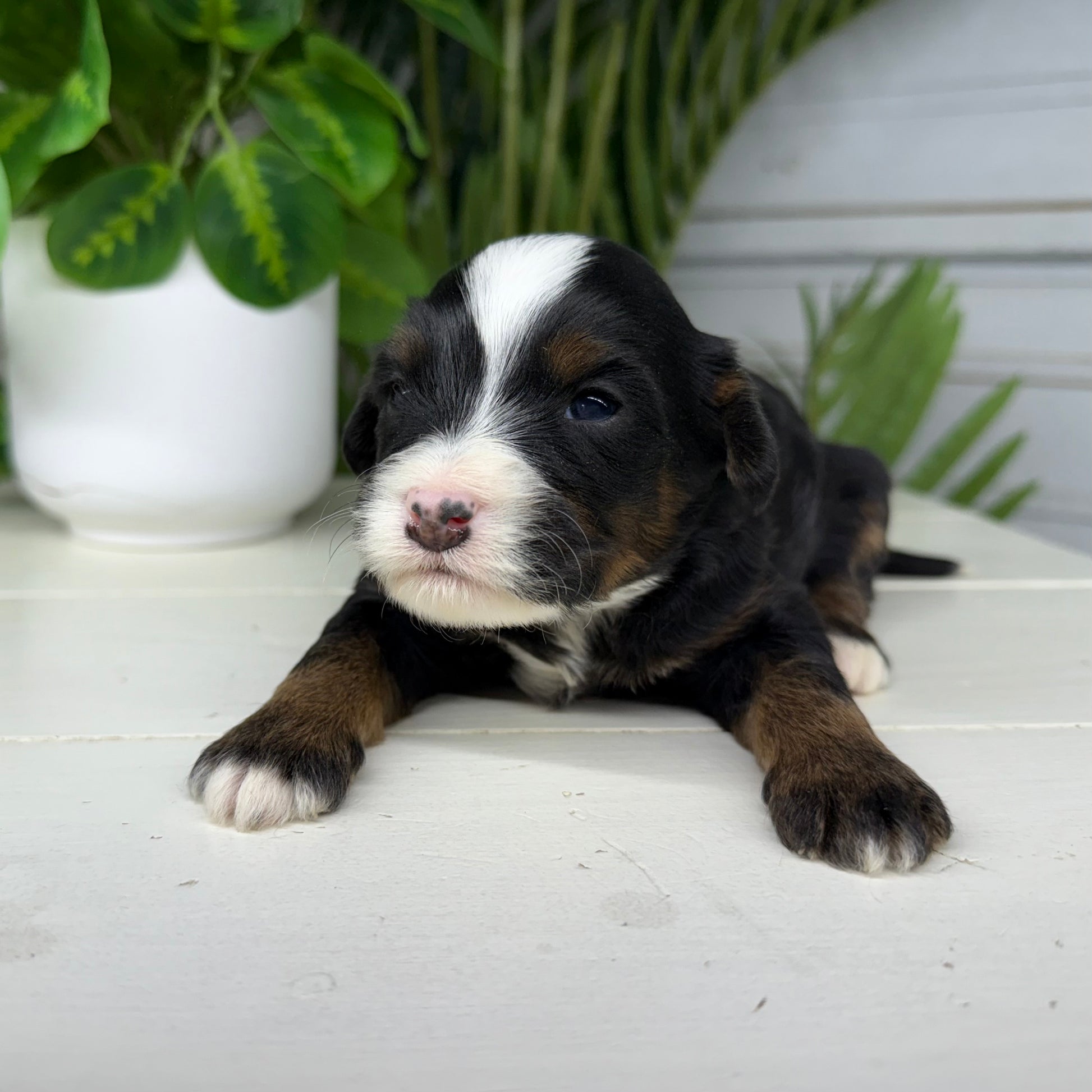 Patrick is a sweet Micro Bernedoodle puppy with a beautiful tricolor coat of black, white, and rich copper that gives him a classic, eye-catching look. His soft, fluffy curls and bright, expressive eyes make him utterly irresistible. Patrick is playful, energetic, and full of personality, yet he also loves snuggling up close for cozy moments. With his affectionate heart and gentle nature, heβs sure to grow into a loyal and loving companion, bringing joy and warmth to everyone around him.