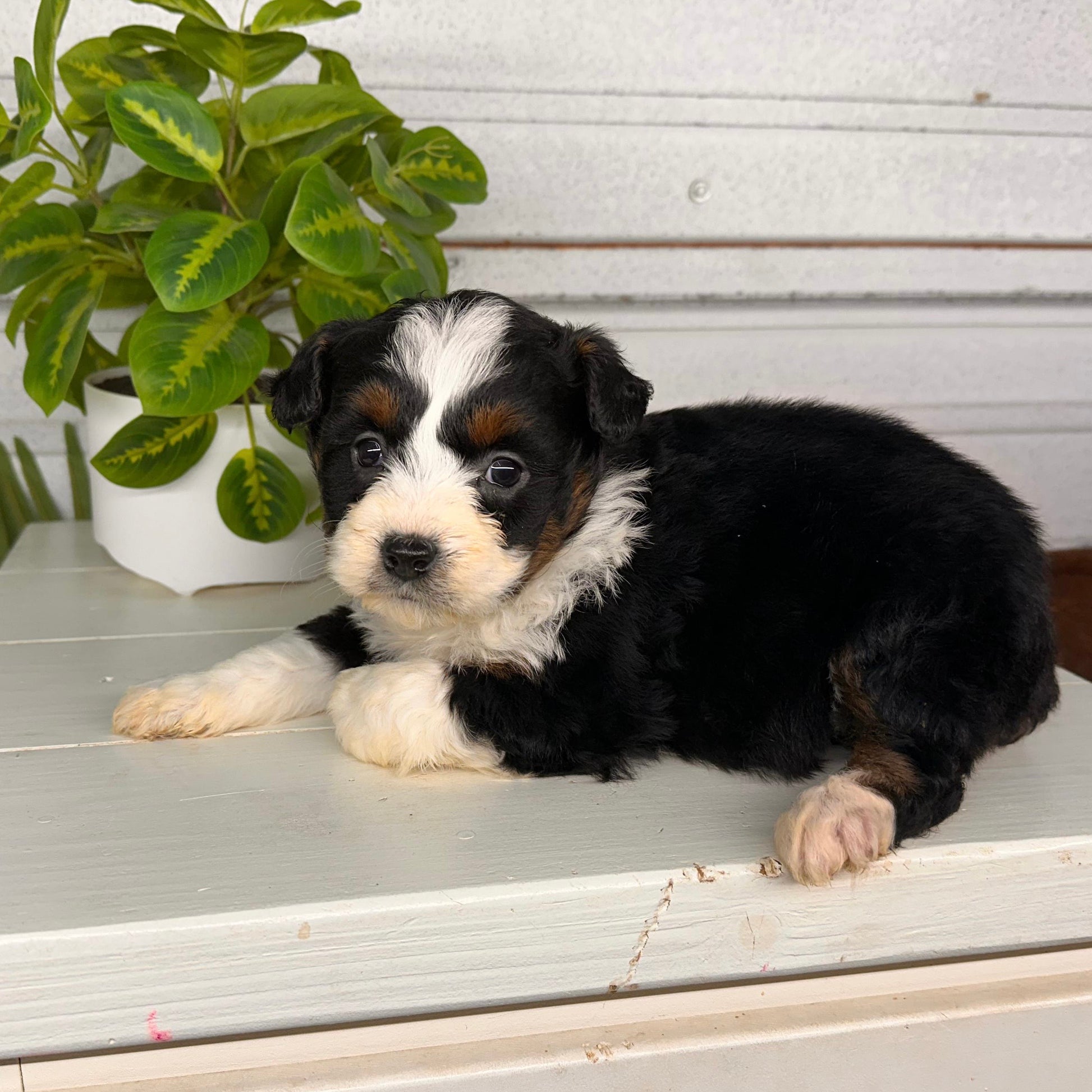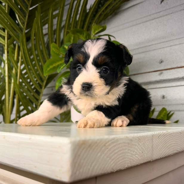 There’s something undeniably special about Rocky — a tiny Micro Bernedoodle with a look that instantly softens your heart. His tricolor coat blends beautifully: deep black, warm copper accents, and snowy white patches that make him look like a plush toy with personality. His round, dark eyes add an innocent, curious charm to every expression he makes. Rocky is the kind of puppy who brings peace just by being close. He has a gentle way about him, always calm, always observing, always ready for a soft cuddle. But don’t let his sweetness fool you — he has a playful spark that shows up the moment he feels comfortable. Little hops, tiny tail wags, and that adorable “let’s explore” energy make him impossible to resist. He’s a puppy with presence, not because he’s loud or bold, but because he radiates warmth. Rocky fits perfectly into any home that loves affection, gentleness, and a companion who stays close to your heart from the very first moment.