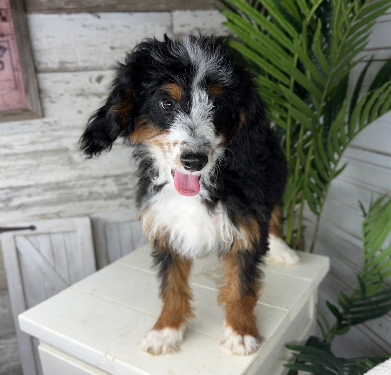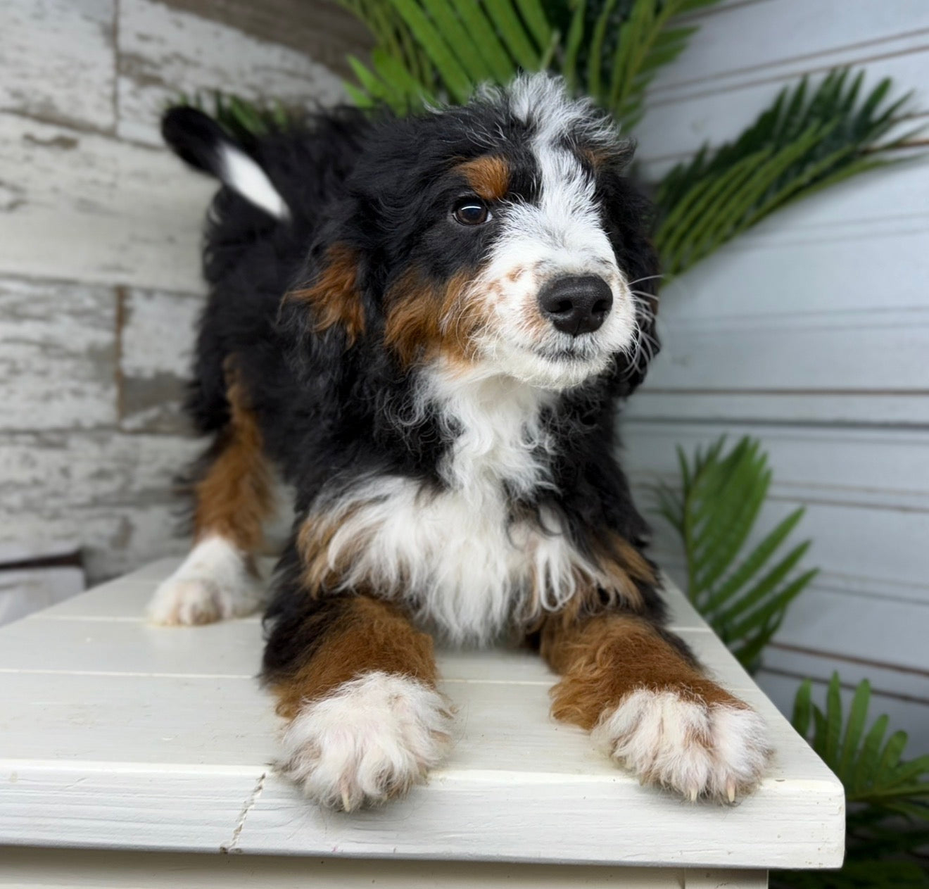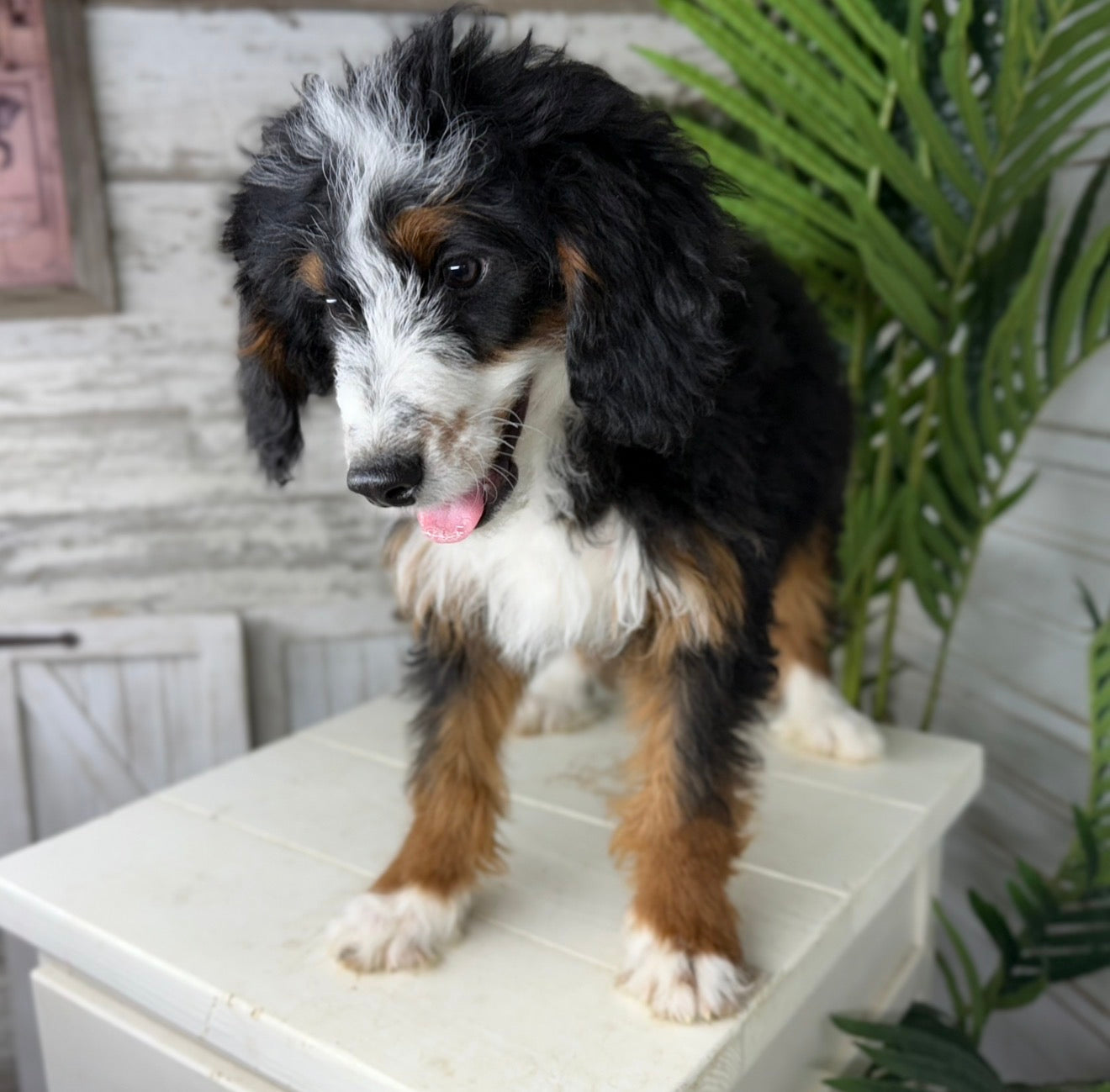 Steve is a striking Tri-Color Mini Bernedoodle with a look that perfectly captures the breed’s signature charm. His coat blends deep black with warm rust points and crisp white markings, giving him a bold yet cuddly appearance. Steve’s personality is just as special as his looks—he’s playful, curious, and full of life, yet loves to settle down for snuggles when the day winds down. With his intelligence and eagerness to please, he’ll be a quick learner and a wonderful companion for any family. This little guy is the perfect mix of charm, loyalty, and fun, making Steve an ideal addition to a loving forever home.