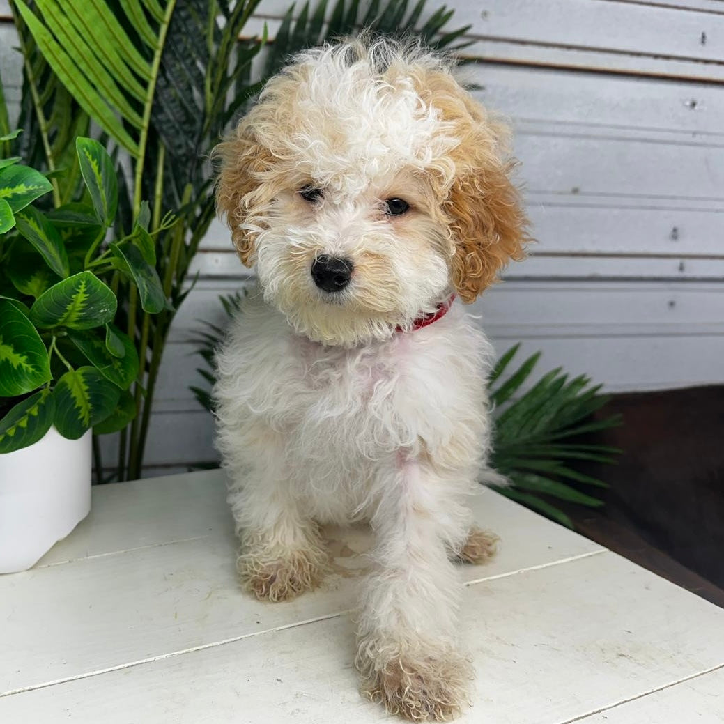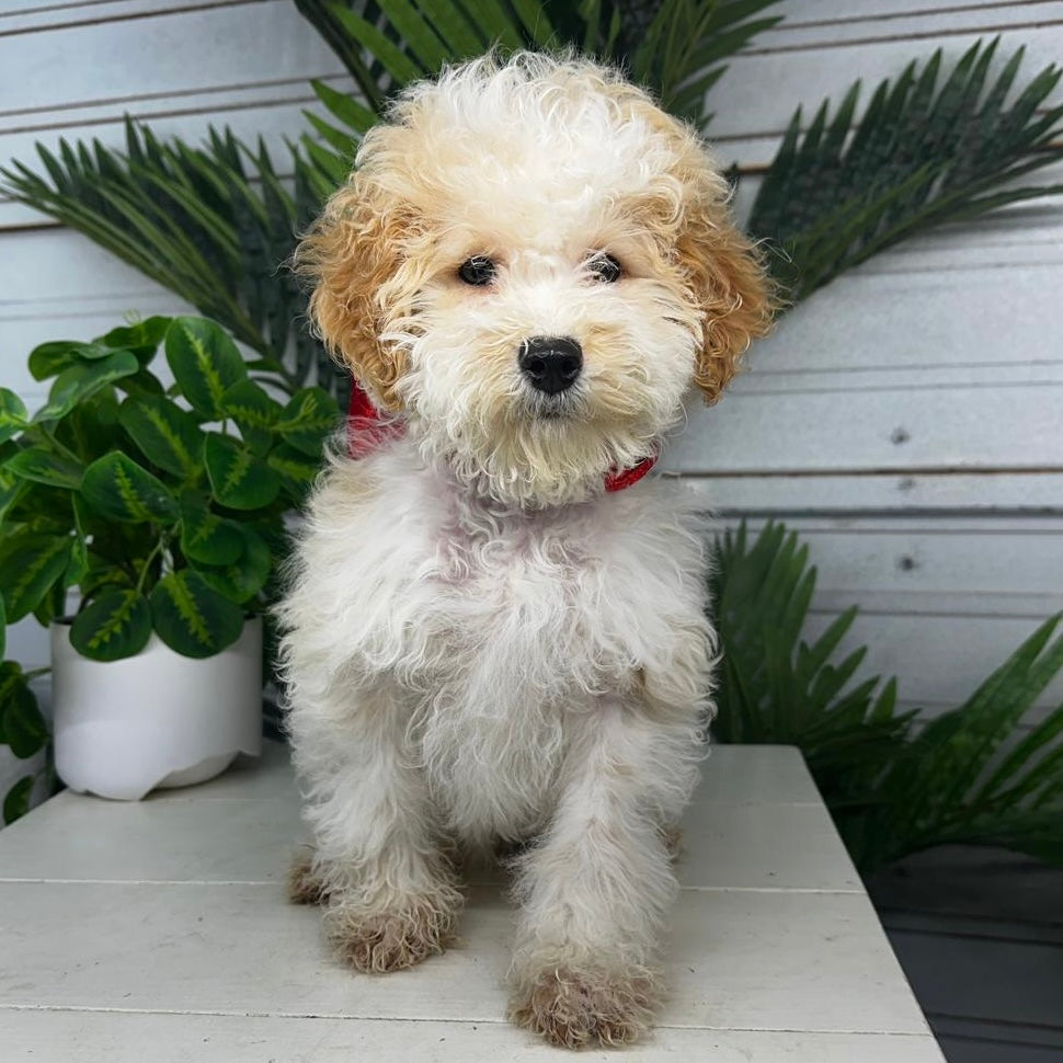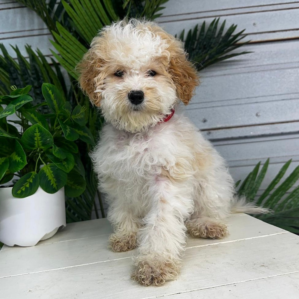 Tinsel is a tiny bundle of joy with a stunning white and red parti coat that makes her truly stand out. As a Micro Goldendoodle, she’s petite, playful, and full of charm, perfect for families who love a cuddly little companion. Her gentle, affectionate personality shines through in every wag of her tail and every curious tilt of her head. Tinsel loves exploring, playing with her siblings, and snuggling in your arms after a day full of fun. Her unique coat coloring and sweet demeanor make her impossible not to fall in love with. With Tinsel, you get a perfect mix of beauty, personality, and endless puppy kisses — a little star that brings joy wherever she goes.