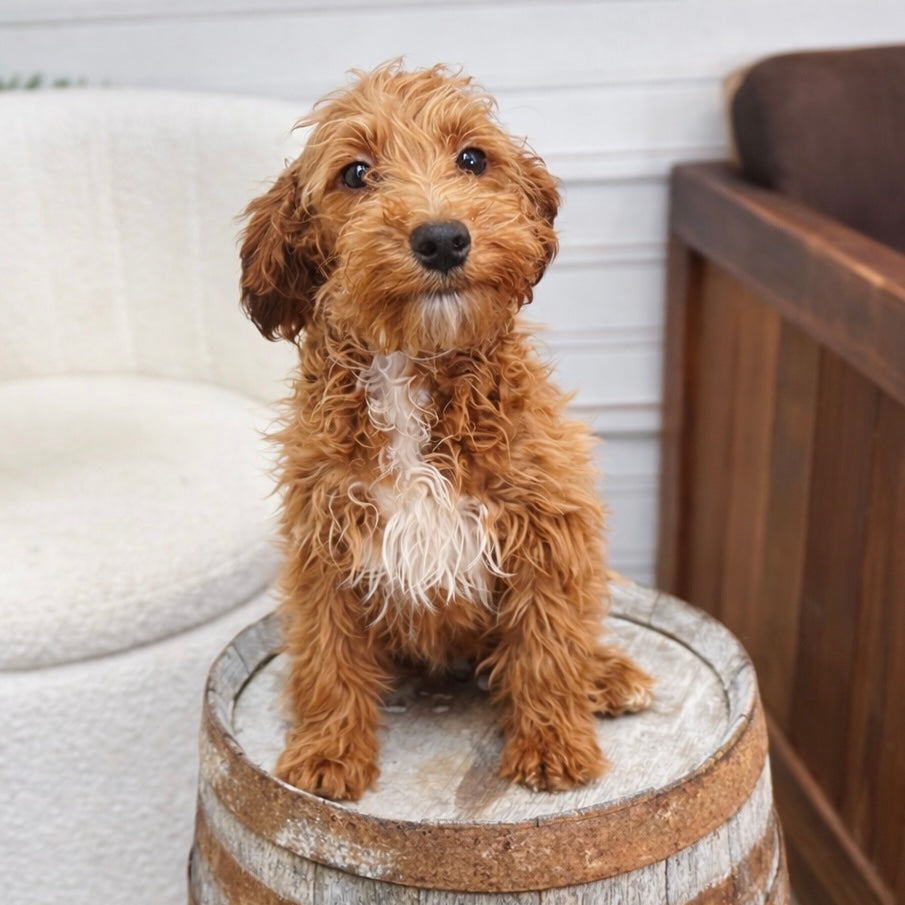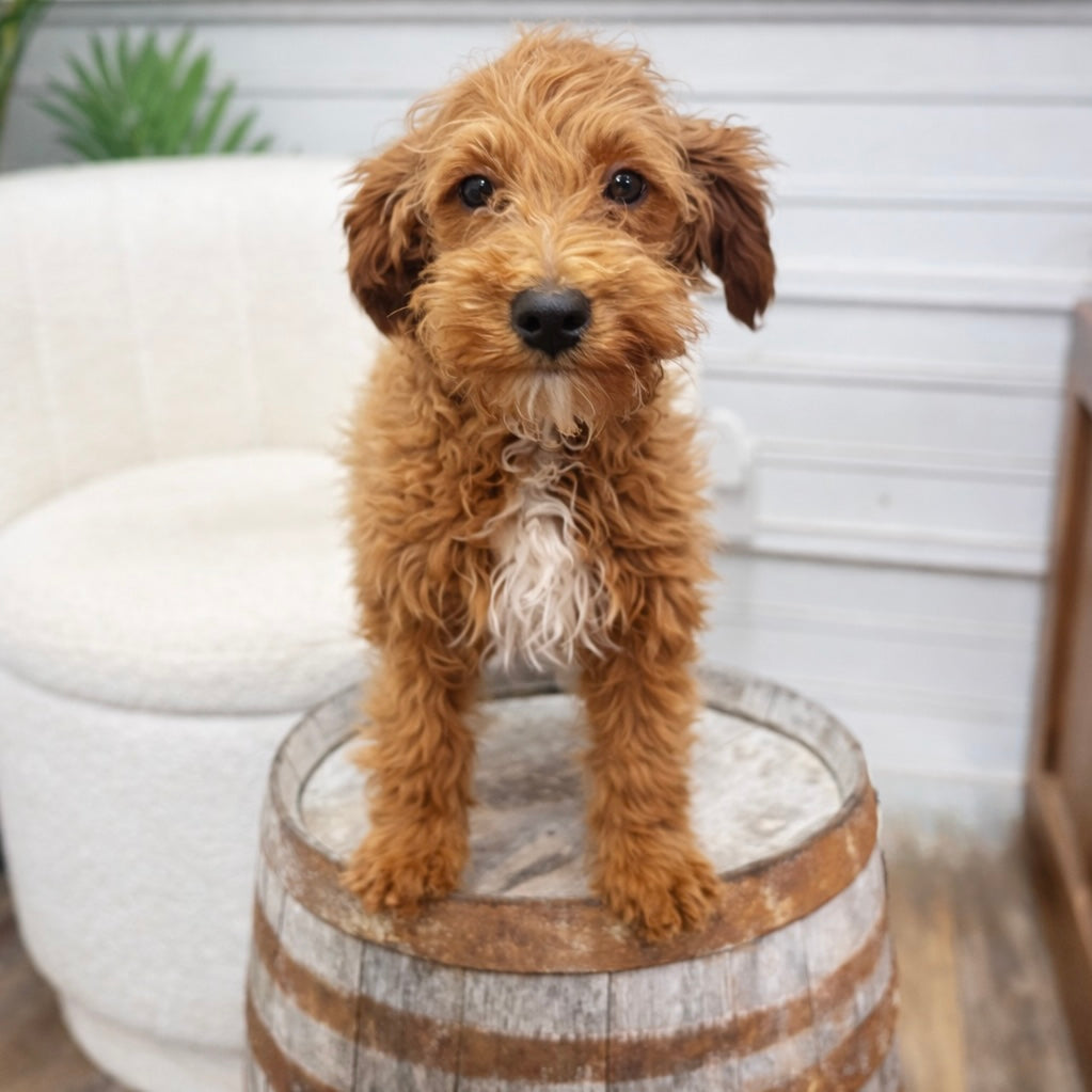 Benji, our handsome red Mini Poodle papa dog. With his rich, velvety red coat and lively, intelligent eyes, Benji is as charming as he is smart. He has a playful, spirited personality and a loyal, affectionate nature that shines through in everything he does. As a papa, Benji passes down not only his striking looks but also his wonderful temperament—bright, loving, and full of character—making his puppies just as delightful as he is.